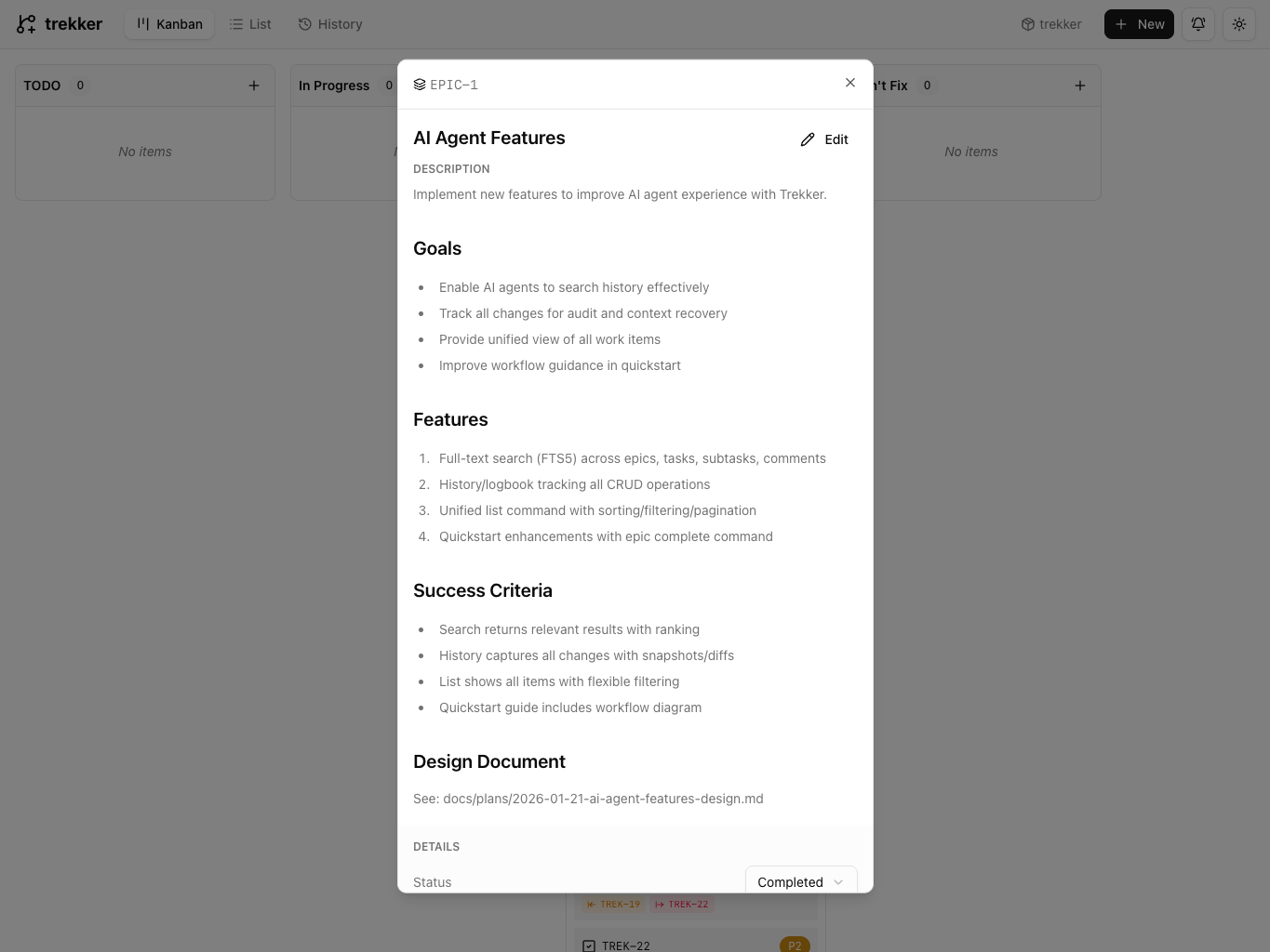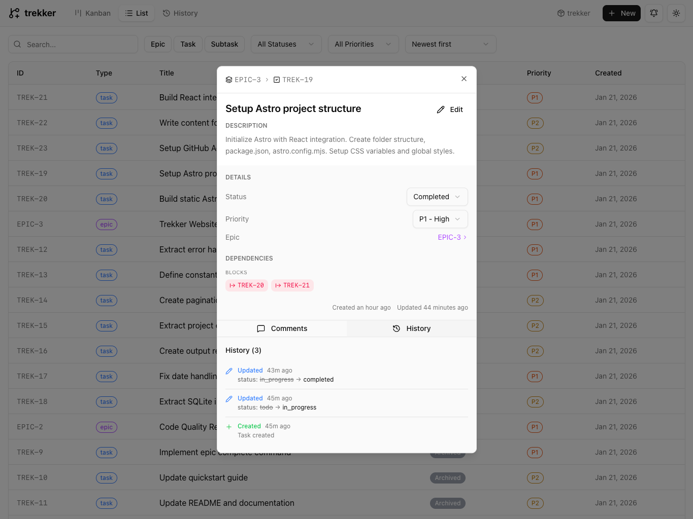 trekker historytrekker history --entity TREK-1trekker history --type task,epic --action create,updatetrekker history --since 2024-01-01 --until 2024-12-31Unified List View